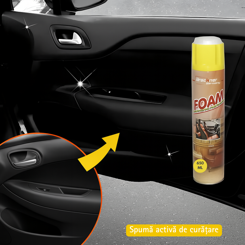 Spumă puternică ce elimină murdăria și grăsimea fără să deterioreze materialele. Sigură pentru piele, plastic, textile și toate părțile interiorului mașinii tale.